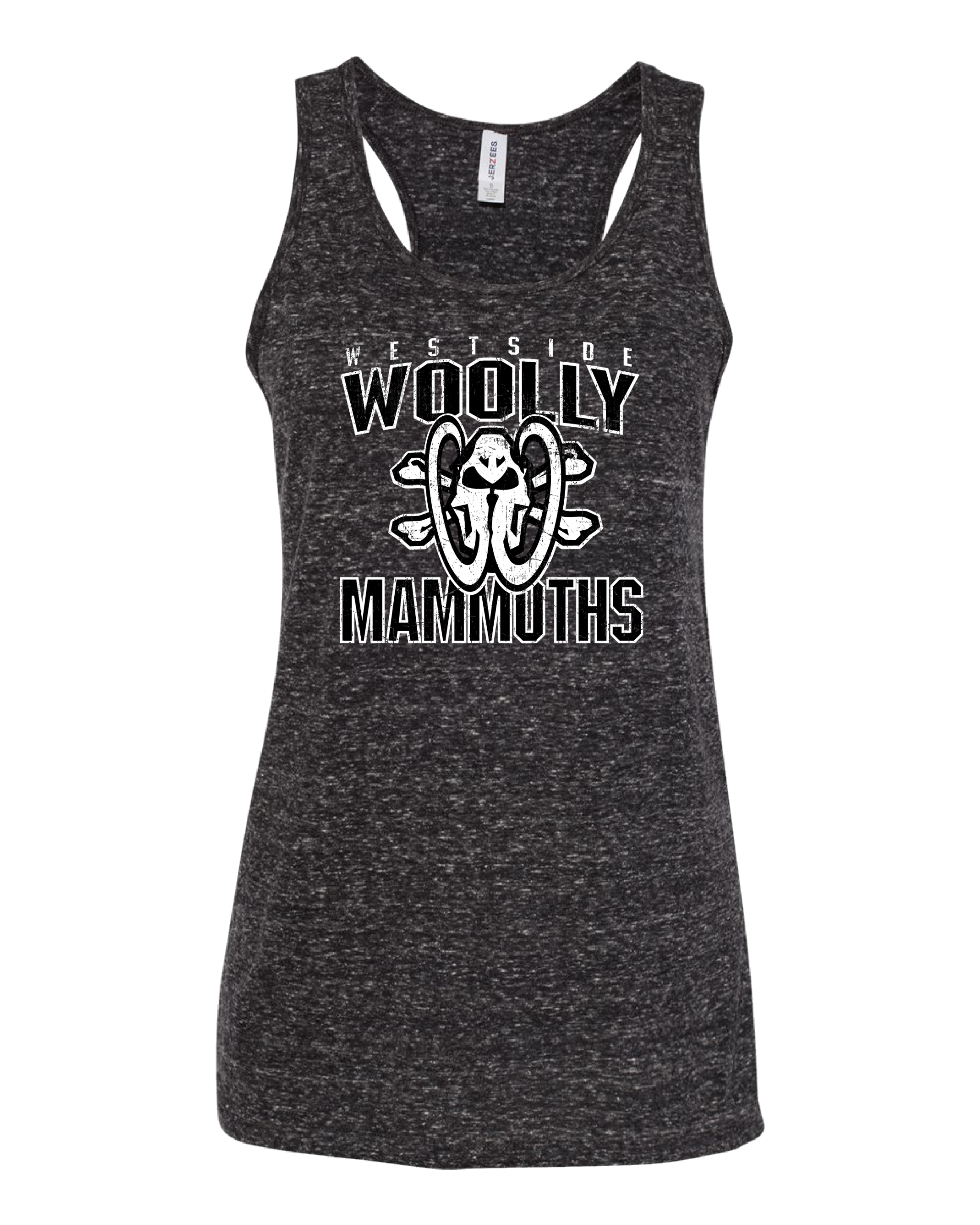 Women’s racerback tank top with black snow heather fabric (88% polyester/12% ring-spun cotton) and curved, drop tail hem featuring the Westside Woolly Mammoth’s skull logo front and center. See product image gallery for size chart.
