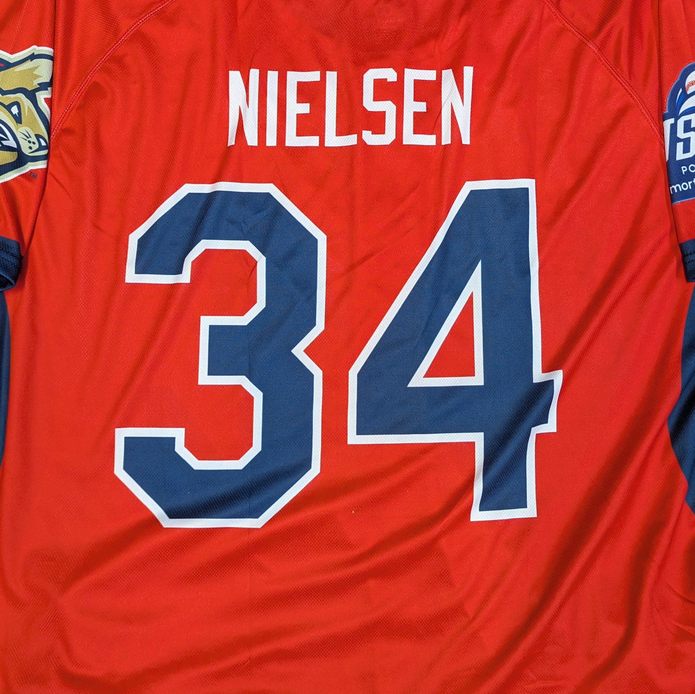 Red with navy blue under sleeves. Team name across the front, mascot and USPBL logos on shoulders. Away game replica.