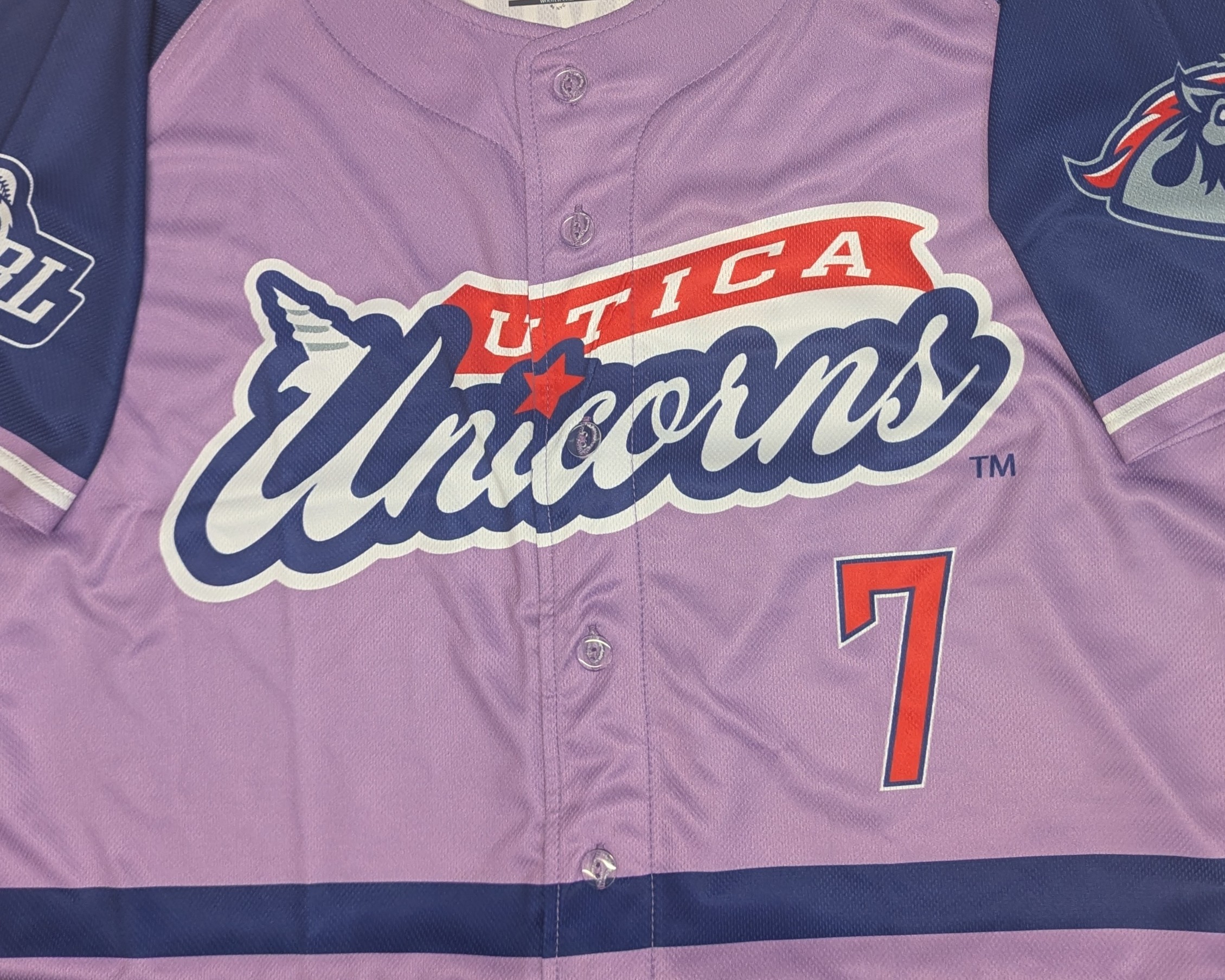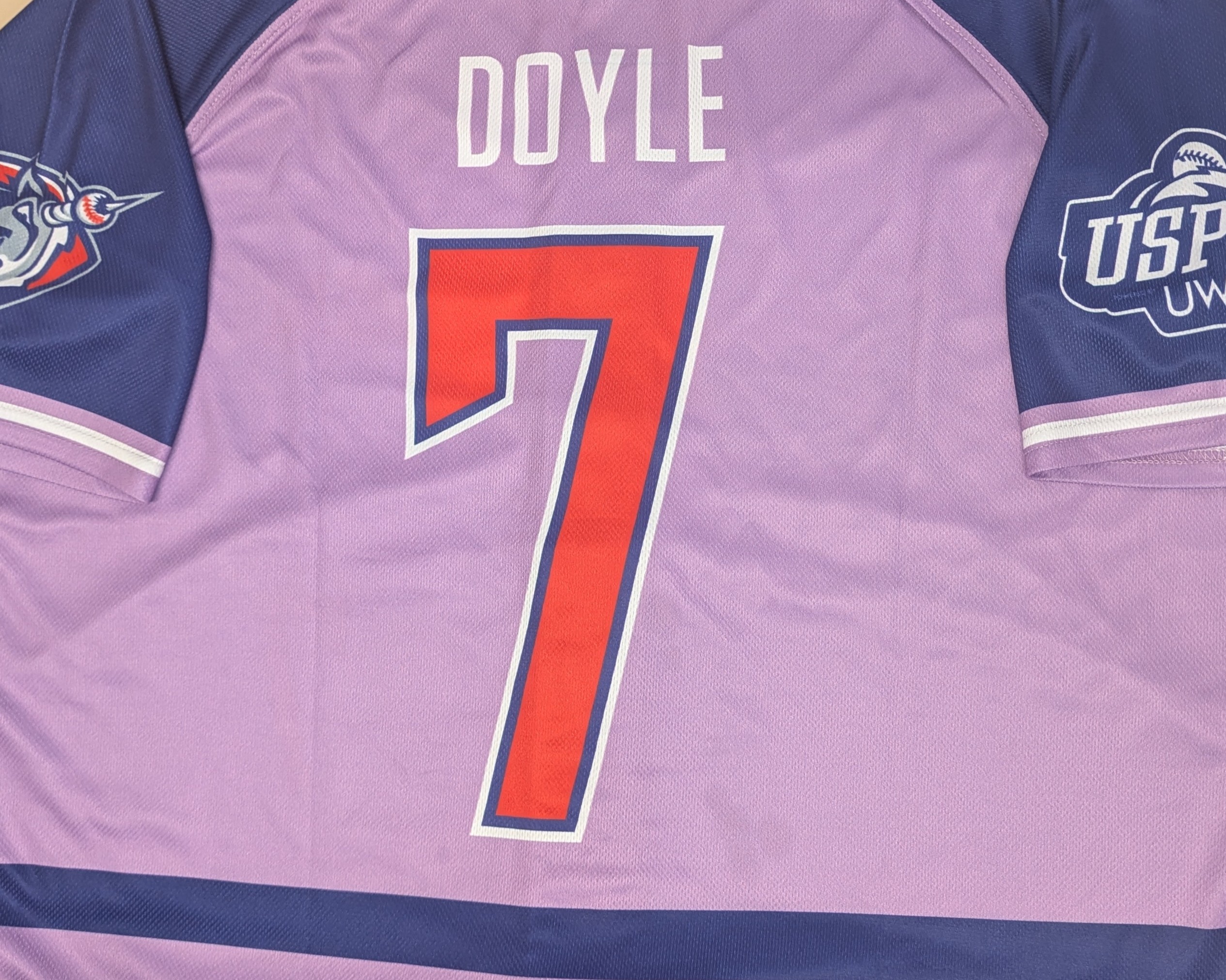 Lilac body with stripes and purple sleeves. Team name across the front, mascot and USPBL logos on shoulders.