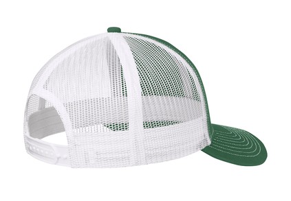 Forest green & white trucker cap features a circular faux leather patch on the front with laser-engraved team name and frog mascot logo.