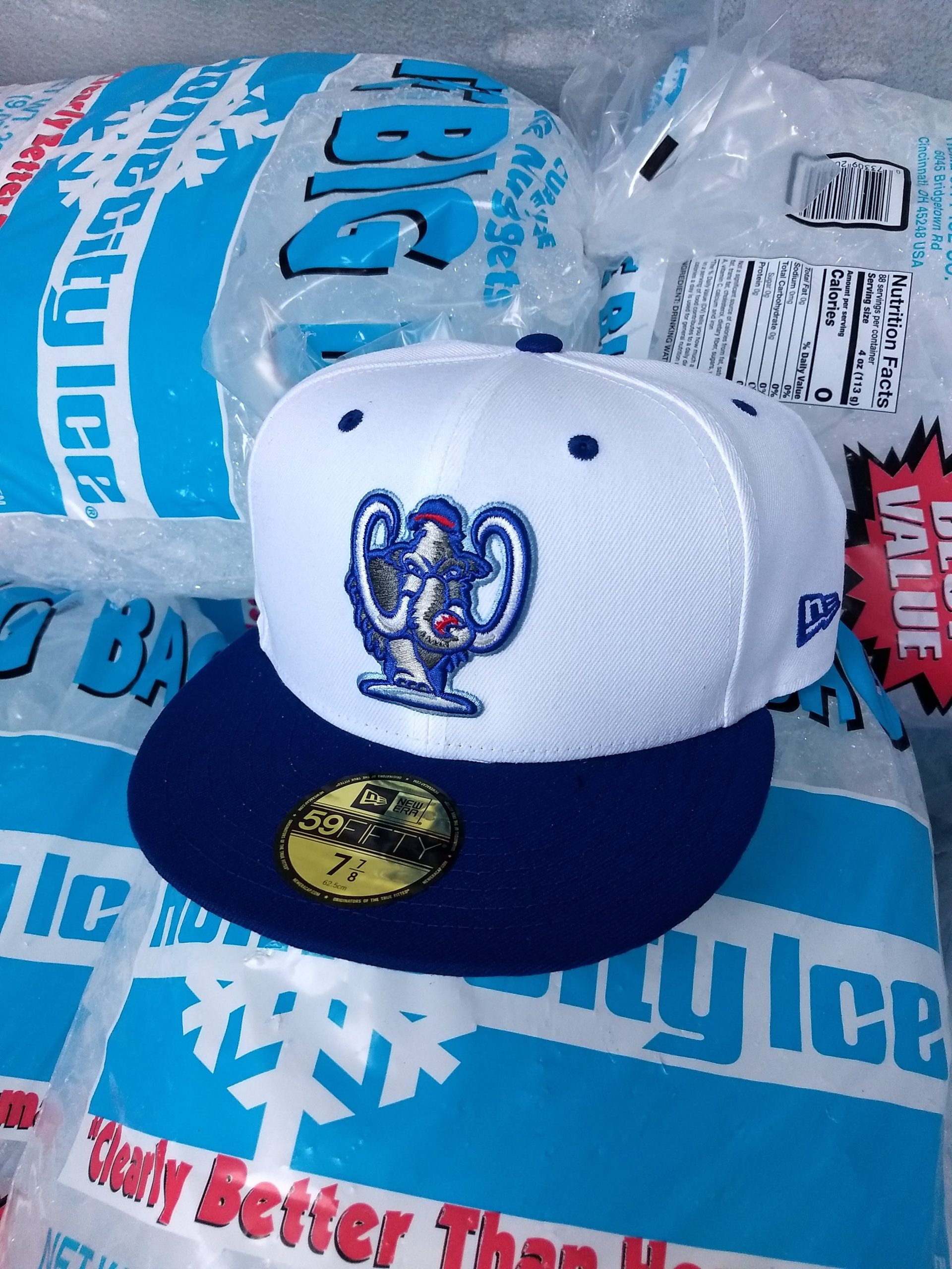 New Era brand fitted hat in the style of our home game caps. Optic white crown, royal blue bill, button, and eyelets, grey under visor. Woolly Mammoth mascot logo on crown, NE logo on side, USPBL logo on reverse.