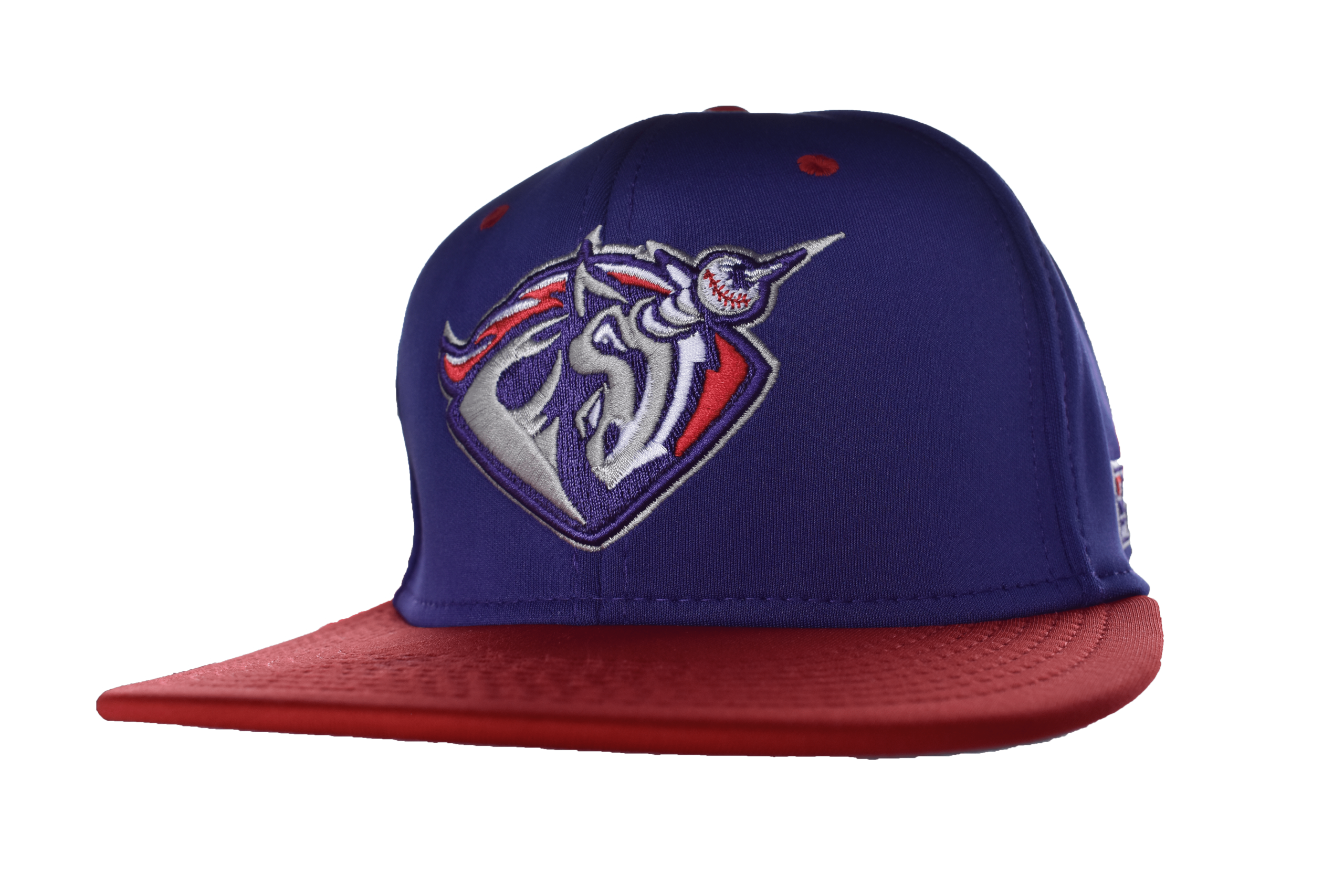 Purple crown, flat red bill, red button and eyelets.